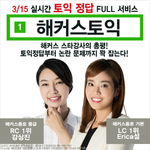 15일 치러질 토익시험을 맞이해 해커스토익(www.Hackers.co.kr)이 ‘실시간 토익 정답 풀서비스’를 제공한다. 해커스토익은 토익시험일 실시간 급상승 검색어 1위(N사/2015년 2월 28일)에 오를 정도로 많은 토익 응시자들이 방문하는 곳이다. ‘해커스토익 풀서비스’를 통해 토익 응시자들은 ▲실시간 토익 정답 확인 ▲해커스 토익 총평 ▲토익점수 환산기 ▲난이도 설문조사 ▲토익 생생인터뷰 등 3월 15일 토익시험에 대한 콘텐츠를 한 번에 경험할 수 있다. 풀서비스 뿐만 아니라 참여자 전원에게 혜택을 제공하는 다양한 이벤트도 마련해 관심이 집중되고 있다.