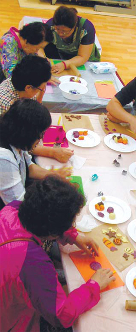 | 동네 어르신을 대상으로 한 울산시 천곡동 ‘책가방작은도서관’의 요리 프로그램 ‘쿠키클레이’ 진행 모습. 어르신들이 이웃의 도움을 받아 정성스럽게 쿠키를 만들고 있다. 책가방작은도서관 제공 |