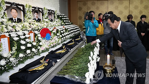 이 총리는 최승호(52)·백동흠(46) 경감, 박근수(29) 경사, 장용훈(29) 경장 등 4명의 영정에 헌화와 분향을 한 후 이들 희생자 유가족을 만나 위로했다.