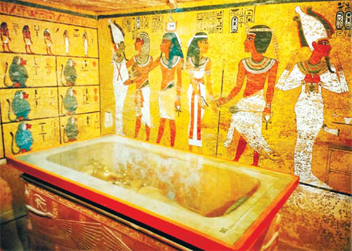 | 이집트고고학박물관 자료 중의 투탕카멘 묘실 한 부분. 석관의 황금가면 안에 파라오 투탕카멘의 미라가 있다. 파라오의 이름은 벽면에 적힌 것처럼 따로 타원형 안에 쓴다. |