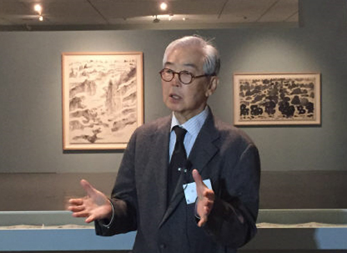 | 송영방 화백이 자신의 회고전이 열리고 있는 전시장에서 지나온 화업을 들려주고 있다.그는 “작품세계를 ‘자기화’하고 득도하는 것은 매우 어려운 일”이라며 ‘길은 멀리 돌아가는 것에 있다”고 말했다. |