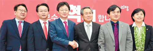 | 새누리당 유승민(왼쪽 세번째), 새정치민주연합 우윤근 원내대표(오른쪽 세번째)가 양당 원내수석부대표 등과 함께 2일 오후 국회의 새누리당 원내대표실에서 공무원연금 개혁을 위한 실무기구 구성 문제를 논의하기 전 악수를 나누고 있다. 이재문 기자 |