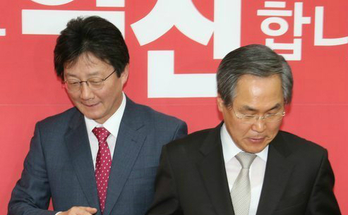 | 새누리당 유승민(왼쪽)·새정치민주연합 우윤근 원내대표가 2일 국회 새누리당 원내대표실에서 공무원연금 협상을 위해 들어서고 있다. |