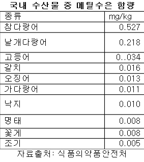 실제로 식약처의 모니터링 결과 참다랑어의 수은(메틸수은) 함량은 1㎏당 0.527㎎로 같은 무게의 가다랑어(국산 참치캔의 주 원료, 0.011㎎)보다 48배나 많았다. 가다랑어 ㎏당 수은 함량은 같은 무게 고등어(0.034㎎)보다 오히려 적고 갈치(0.016㎎)ㆍ오징어(0.013㎎)와 비슷했다.