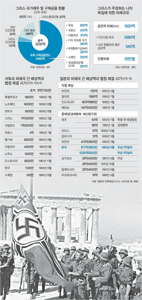 이원덕 국민대 교수(국제학부)가 학술지 ‘동북아역사논총’에 게재한 논문 ‘일본의 전후 배상외교에 관한 고찰’에 따르면 2차대전 후 연합국은 독일의 국가 배상 의무를 통일 이후로 미뤘다. 소련과 폴란드 등 옛 동구권은 아예 배상청구권을 포기해 독일의 부담을 덜어주었다. 하지만 서독은 나치 불법 행위와 홀로코스트(유대인 대학살) 희생자들에 관한 연방보상법을 근거로 1950∼60년대 프랑스와 네덜란드, 그리스, 오스트리아 등 12개 서방 피해국 개인들에게 총 9억7100만마르크의 배상금을 지불했다.