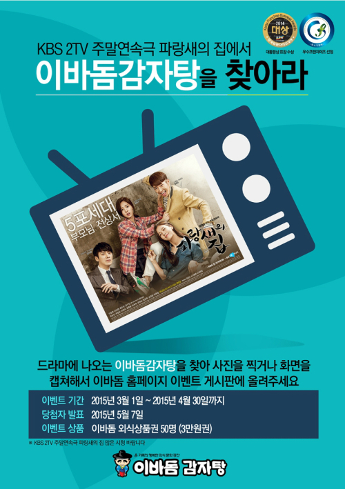 이바돔감자탕이 KBS 2TV 주말연속극 `파랑새의 집` 제작지원을 기념해 이벤트를 진행 중이다. 드라마 속에 이바돔감자탕이 등장하는 장면을 찾아 사진을 캡쳐하거나 찍어 이바돔 홈페이지( www.ebadom.com) 이벤트 게시판에 올리면 참여가 완료된다. 해당 이벤트는 이달 30일까지 진행되며 추첨을 통해 총 50명에게 이바돔 외식상품권 3만원 권을 증정한다. 이바돔감자탕은 드라마 ‘파랑새의 집’에서 한선희(최명길 분)가 일하는 매장으로 그려지고 있다. `파랑새의 집`은 매주 토∙일요일 저녁 7시 50분 방송된다.
