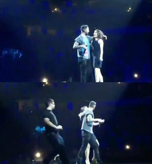 지난 6일(현지시간) 미국 캘리포니아주 애너하임의 혼다 센터에서 열린 마룬5 콘서트에서 한 여성 팬이 무대 위로 난입해 리바인을 습격했다.