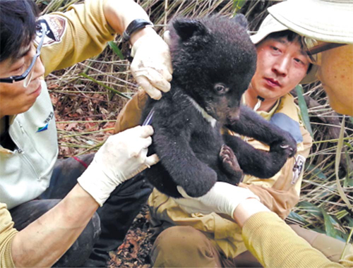 | 지리산 반달가슴곰 새끼 5마리 출산 지난 3월28일 조사에서 지리산에서 멸종위기종 1급인 반달가슴곰 새끼 5마리가 태어난 것이 확인되면서 지리산에는 37마리의 반달곰이 야생하게 됐다. 국립공원관리공단 직원들이 어미곰 RF-21이 양육을 포기하고 달아나 야생동물의료센터에서 인공 포육 중인 반달가슴곰 새끼에게 주사를 놓고 있다. 환경부 제공 |