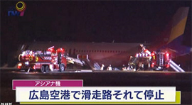 | 일본 NHK방송의 14일 아시아나항공 여객기 착륙사고 보도 장면. 사고 뒤 히로시마공항 활주로에 정지해 있는 여객기 앞에 소방차의 모습이 보인다. NHK 캡처 |