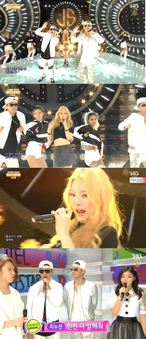 지누션은 19일 방송된 SBS '인기가요'에서 신예 장한나와 함께 신곡 '한 번 더 말해줘' 무대를 꾸몄다.