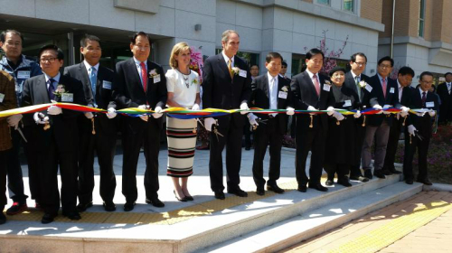 | 예수 그리스도 후기성도 교회 서울서 스테이크 개관식에서 참석자들이 테이프를 커팅하고 있다. |