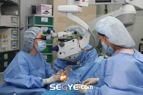 분당차병원 안과 송원경 교수(가장 좌측)가 노인성 황반변성의 배아줄기세포치료제 임상 시술을 하고 있다. 사진= 분당차병원 제공
