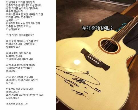 약 한 달 전 '수르수르 만수르'라는 어플에 "기타를 손가락 부러지도록 배우고 싶습니다. 저번부터 부모님에게 허락을 구해봤지만 계속 안 된다고 하시네요. 만수르님 제게 기타 하나만 부탁드려요!! 제가 기타를 띵가띵가 연주할 수 있게 도와주세요!! 수르수르 만수르"란 글을 게재했다.
