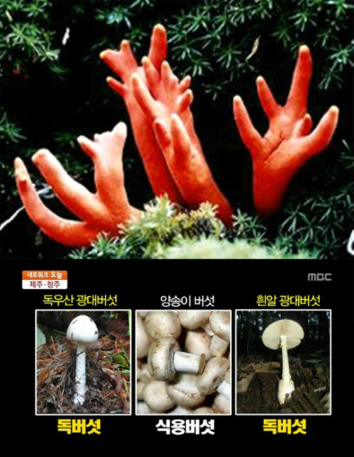 한편, 산속에서 흔히 발견되는 독우산 광대버섯과 흰알 광대버섯은 식용인 양송이버섯과 모양이 비슷하지만, 소량만 섭취해도 생명을 잃을 수 있다. 그리고 식용인 '수원무당버섯'과 닮은 독버섯 '냄새무당버섯'도 조심해야 한다.