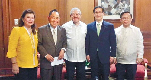 | 손병호 천주평화연합(UPF)·평화대사협의회 중앙회장(오른쪽 두번째)과 필리핀의 펠로시아노 벨몬트 국회의장(가운데), 지나 드 베네시아 국회의원(왼쪽 첫번째), 호세 드 베네시아 전 국회의장(왼쪽 두번째), 줄리어스 말릭뎀 필리핀 가정연합 회장이 12일(현지 시간) 필리핀 국회의장실에서 기념촬영을 하고 있다. |