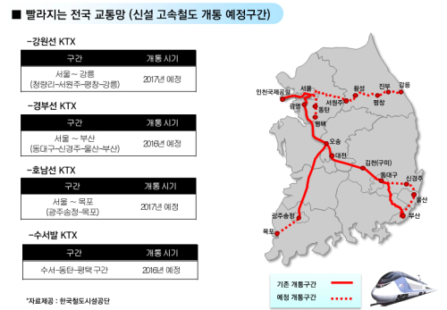 올 초 개통된 KTX호남선(서울 용산역-광주송정역)을 시작으로 평창올림픽에 맞춰 개통되는 ▲KTX 강원선(인천국제공항-서울 청량리-서원주-평창-강릉) ▲신경주·울산 등의 구간을 지나가는 KTX 경부선(서울 용산역-동대구-신경주-울산-부산) 등이 2017년 말 까지 신규구간이 추가된다. 이에 따라 전국 각지 2시간40분내 반나절 생활권이 가능해지면서 주택시장에 큰 영향을 미치고 있다.