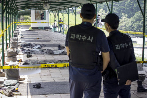 | 과학수사대 수사관 2명이 총기난사 사고가 일어난 다음날인 14일 오후 서울 내곡동 송파·강동 동원예비군 훈련장 내 사격장을 살펴 보고 있다. 군은 이날 언론에 사고가 발생한 현장을 공개했다. 김범준 기자 |