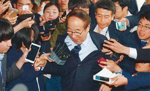 이날 오전 9시45분쯤 서울중앙지검 청사에 도착한 박 전 회장은 취재진에게 “성실하게 검찰 조사에 응하겠다”고 말한 뒤 곧장 조사실로 향했다. 박 전 회장이 청사에 도착하자 ‘박용성 이사장님 사랑합니다’라고 적힌 종이를 들고 있던 중앙대 남녀 학생 2명이 박 전 회장의 양복 상의 윗쪽 주머니에 스승의 날 카네이션을 꽂아줬다. 중앙대 인수 이후 대학 개혁 추진에 앞장 섰던 박 전 회장은 한때 개혁 동지였던 박 전 수석과의 부적절한 유착으로 피고인 석에 서야 할 처지에 놓였다.