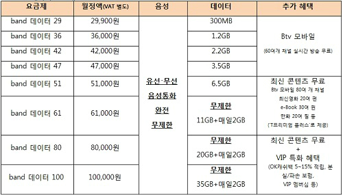 대용량 모바일 콘텐츠가 지속 증가하는 추세를 감안해 'band 데이터 요금제' 가입 고객은 'band 데이터 36·42·47·51'요금제별 데이터 제공량은 각각 1.2·2.2·3.5·6.5GB로 업계 최대 수준의 데이터를 사용할 수 있다.