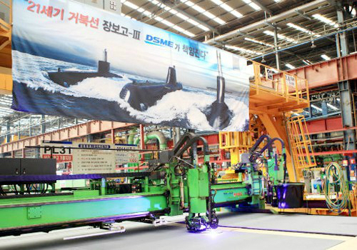지난해 11월 27일 경남 거제시 대우조선해양 옥포조선소에서 3000t급 중형 잠수함인 `장보고-Ⅲ` 건조 시작을 알리는 강재 절단 작업이 진행되고 있다.
