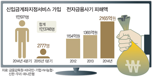 대대적인 홍보에도 그 효과는 신통치 않았다. 6개 은행의 안심통장 가입자 수는 지난해 4분기 1만971명, 지난 1분기 2777명이다. 4분기 마지막 달에 홍보를 했음에도 1분기 들어 가입자 수가 큰 폭으로 떨어진 것이다. 시중은행의 한 관계자는 이에 대해 “안전하고 편리한 서비스여야 고객이 가입할 텐데 이체 금액 제한으로 편리성보다는 보안성에 중점을 뒀기 때문에 고객의 선택을 받기 어렵다”고 말했다.