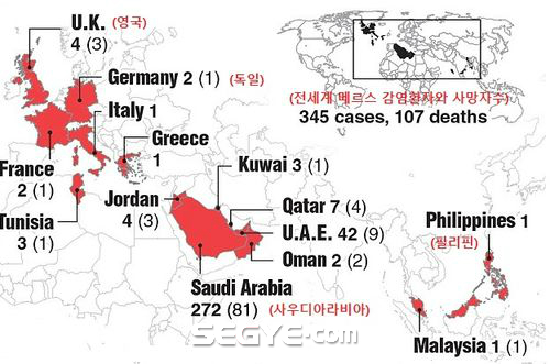 아시아에서는 말레이시아와 필리핀에서 각각 1명씩 감염돼 말레이시아 환자가 사망했다. 전 세계적으로는 345명의 메르스 감염 환자 중 107명이 사망했다(유럽질병예방제어센터: European Center for Disease Prevention and Control 자료 참조).