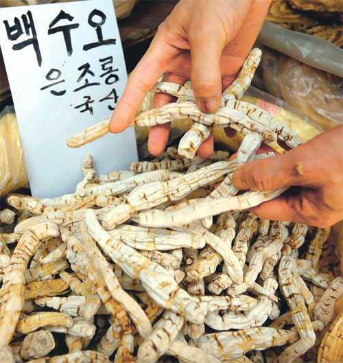 | 26일 서울시내 한 재래시장에서 상인이 백수오를 정리하고 있다. 식품의약품안전처의 이날 발표에 따르면 시중에 유통되는 백수오 제품 가운데 이엽우피소가 검출되지 않은 ‘진짜’ 백수오 제품은 5%에 불과한 것으로 나타났다. |