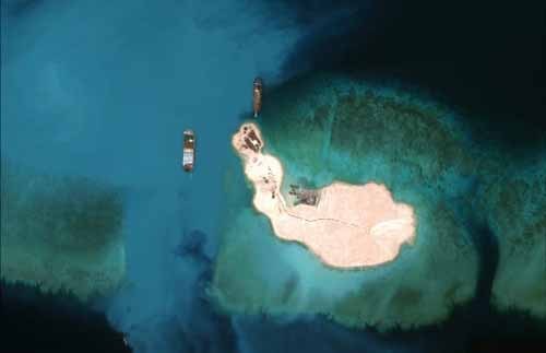 | 중국 국적의 화물선들이 지난 3월16일 중국과 필리핀, 베트남 등 6개국이 영유권 분쟁을 벌이고 있는 남중국해 스프래틀리군도 내 팡가니방 산호초 인공섬 건설 현장을 오가고 있다. 미국 국제전략문제연구소(CSIS) 제공 |