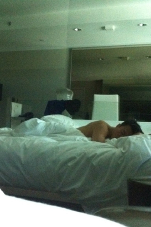 공개된 사진 속에는 상반신 누드로 침대에 누워 눈을 감고 잠을 자는 박진영의 모습이 담겨 있었다.