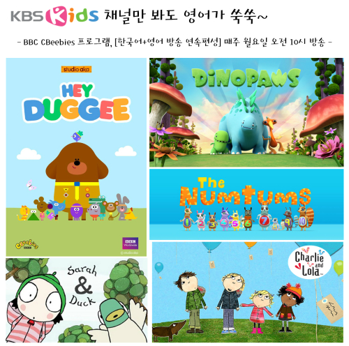 매주 월요일 오전 10시 KBS Kids채널을 통해 인기리에 방영중인 BBC 어린이 콘텐츠 'Dinopaws' 'The Numtums' 'Sarah & Duck' 'Hey Duggee' 'Charlie and Lola'를 한번은 한국어 더빙으로 방송하고 바로 이어 영어원어로 연속 방송한다.