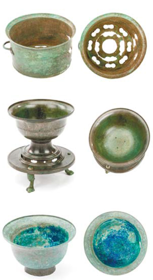 | 울산시 울주군 율리 영축사(울산광역시 기념물 제24호) 터에서 발견된 청동시루(위부터) 와 청동향로, 청동완. 울산박물관 제공 |