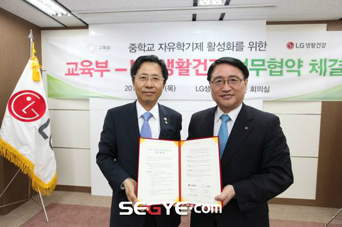 LG생활건강과 교육부는 이날 LG광화문 빌딩 15층 회의실에서 김재춘 교육부 차관과 배정태 LG생활건강 부사장이 참석한 가운데 '중학교 자유학기제 활성화를 위한 업무협약'을 체결하고 중학교 자유학기제가 학생들의 소질과 적성을 개발하는 수단으로 정착될 수 있도록 노력하고 적극 지원하기로 했다.