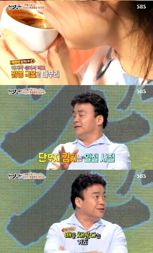 이어 "단무지나 김치는 중간에 짜장과 볶음밥을 섞어먹기 전까지는 먹지마라"며 "짜장에 볶음밥을 섞어서 먹는 것은 배를 채우려고 그런 것"이라 지적했다.