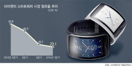 14일 미국 시장조사 기관 스트래티지 애널리틱스(SA)에 따르면 타이젠의 올해 1분기 스마트워치 OS 점유율이 23.1%에 그쳤다. 지난해 2분기 과반에 가까운 47.8%를 기록하면서 등장과 함께 1위에 올랐던 기세는 온데간데없이 사라졌다. 구글이 작년 6월 ‘웨어러블’(착용형) OS ‘안드로이드웨어’를 출시하면서 바로 밀리기 시작했다. 지난해 3분기 40%, 4분기 25.7%에 이어 올해 들어 작년 2분기의 반토막 수준까지 주저앉았다.