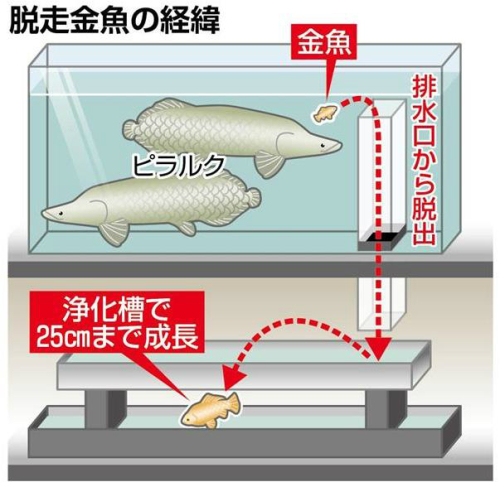 깜짝 놀란 사육사들이 조사한 결과 금붕어는 피라루쿠를 피해 여기저기 옮겨 다니다 배수구를 입구를 찾아냈고 배수구로 들어간 금붕어는 연결된 정화조에 떨어지게 됐다.