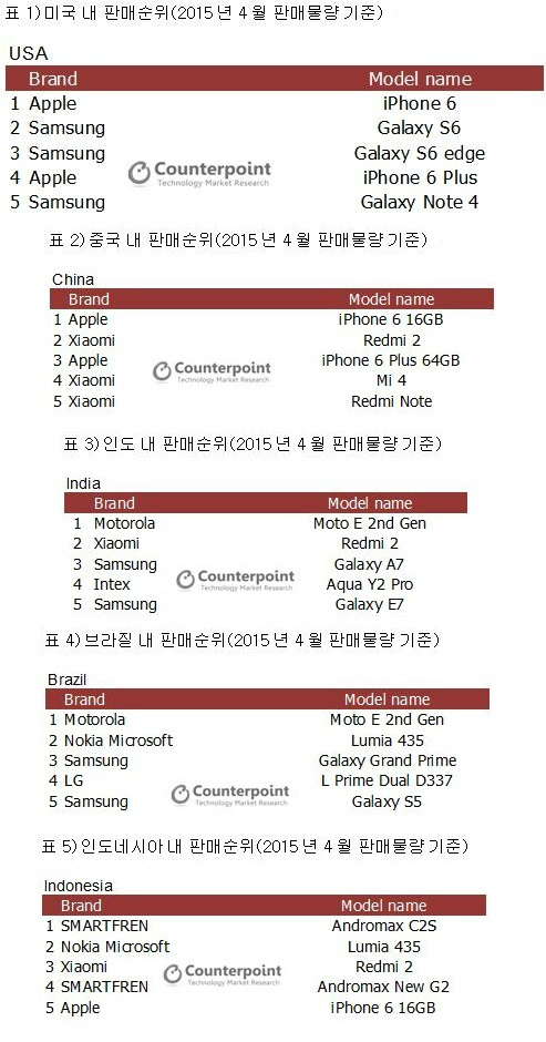 전 세계에서 스마트폰 시장 규모가 가장 큰 미국·중국·인도·브라질·인도네시아 등 5개 국가 중 단 한 곳에서도 삼성전자는 ‘갤럭시S6’와 ‘갤럭시S6 엣지’는커녕 노트를 포함한 갤럭시 시리즈를 판매순위 1위에 올리지 못했다.
