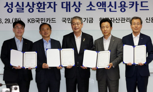 채무 성실상환자 소액신용카드 발급 협약 입력 : 2015-06-29 20:37:17 수정 : 2015-06-29 20:37:17 구글 네이버 유튜브 29일 오후 서울 중구 신용회복위원회에서 임종룡 금융위원장 등이 ‘채무조정 성실상환자 대상 소액신용카드 발급 협약’을 체결한 뒤 기념촬영을 하고 있다. 사진 왼쪽부터 김윤영 신용회복위원회 위원장, 이종욱 국민행복기금 이사장, 임 위원장, 김덕수 KB국민카드 대표이사, 홍영만 한국자산관리공사 사장. <연합>연합> Copyright ⓒ 세계일보. 무단 전재 및 재배포 금지 연합 방글