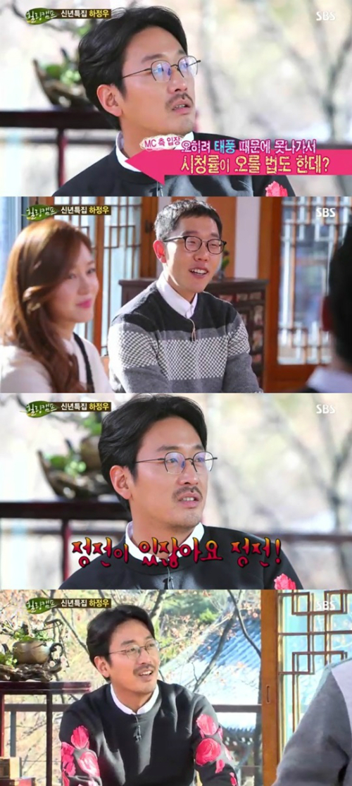 이날 하정우는 자신의 첫 출연 때 시청률이 기대보다 부진했던 것에 대한 질문에 “그때 태풍이 왔었다”고 말하며 “태풍 속보 방송에 묻혔다”고 주장했다. 자연재해가 시청률에 영향을 줬다는 것.