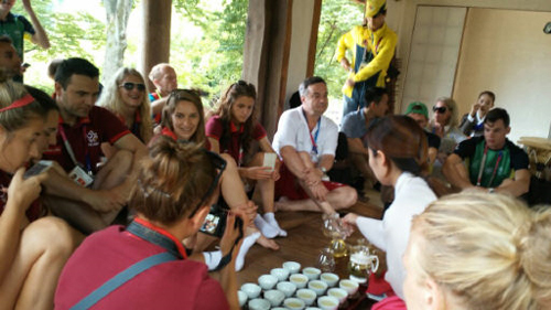 | 광주U대회 기간 운영되는 팸투어로 전남 담양군 환벽당을 찾은 외국선수들이 다도체험을 하면서 신기해하고 있다. 광주시 제공 |