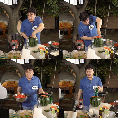 지난달 27일 방송된 MBC 예능프로그램<마이리틀텔레비전>(이하 ‘마리텔’)에서는 백종원이 깻잎 모히토를 능가하는 과일주의 최고봉을 소개하겠다며 수박 1통을 통째로 활용한 수박주를 만들어 눈길을 끌었다.