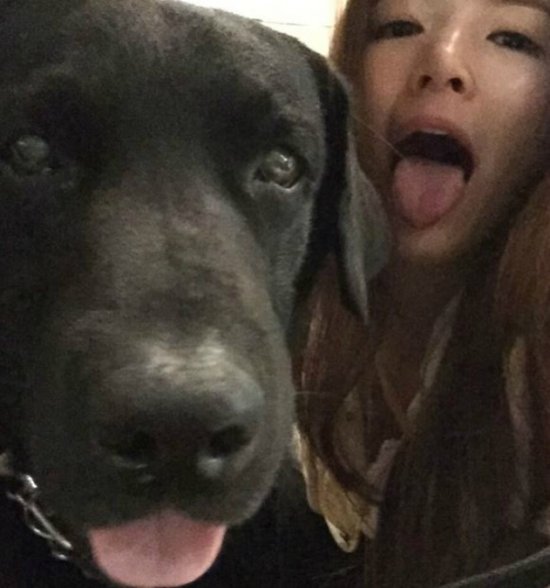 공개된 사진 속 유승옥은 검은색의 강아지 옆에서 혀를 쑥 내밀고 함께 포즈를 취하고 있다.