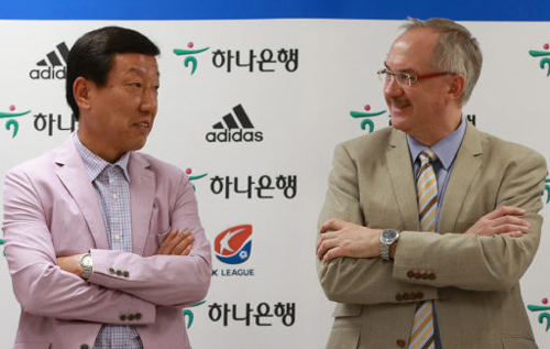| K리그 올스타전을 앞두고 16일 경기도 안산 와스타디움에서 열린 기자회견에서 최강희 감독(왼쪽)과 울리 슈틸리케 감독이 서로 바라보면서 포즈를 취하고 있다. 안산=연합뉴스 |