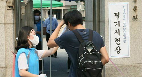 지난 6월 서울시공무원 임용시험일인 서울 강서구의 한 시험장 앞에서 수험생들이 중동호흡기증후군(메르스) 예방을 위한 발열검사를 받고 있다.