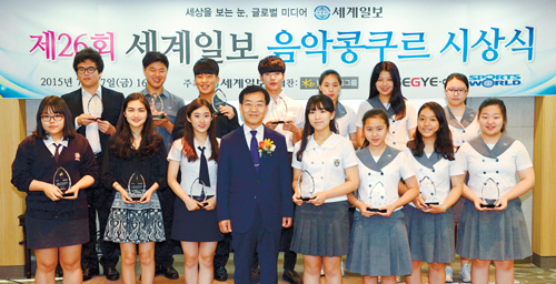 세계일보 콩쿠르 영광의 수상자들 입력 : 2015-07-17 21:28:01 수정 : 2015-07-17 21:28:01 구글 네이버 유튜브 서울 종로구 세계일보 유니홀에서 17일 열린 ‘제26회 세계일보 음악콩쿠르 시상식’에서 세계일보 차준영 사장(앞줄 왼쪽 네 번째)과 수상자들이 기념촬영을 하고 있다. 5월19∼28일 서울 금천구청 금나래아트홀에서 열린 이번 대회에서는 피아노·바이올린·첼로·비올라 4개 부문의 고등부, 중등부 경연에 95명이 참가해 실력을 겨뤘다. 남정탁 기자 Copyright ⓒ 세계일보. 무단 전재 및 재배포 금지 세계일보 강구열