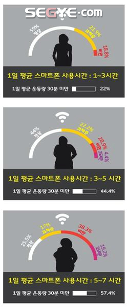 365mc 대전 지방흡입센터 김우준 원장은 “스마트폰을 주로 이동하는 차 안, 대중교통을 이용할 때, 휴식 중, 취침 전 등 앉아 있거나 움직임이 적은 상태에서 이용하기 때문에 상대적으로 하루 운동량이 줄어들기 마련이고, 반대로 과체중, 비만도가 높을수록 운동을 기피하거나 움직임이 적은 특성이 있어 스마트폰 사용량이 늘어나는 경향이 보일 수 있다”고 전했다.