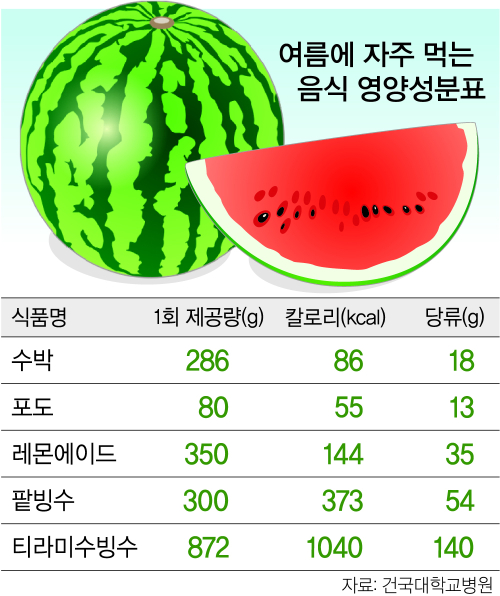 더위를 피하기 위해 먹는 여름철 간식도 혈당조절을 어렵게 만드는 요인 중 하나다. 여름에 자주 먹는 과일이나 음료로 인해 당분 섭취량이 증가하기 때문이다. 특히 아이스크림과 팥빙수는 대부분 하루 당류 섭취 권장량인 50g이 넘는 제품이 많으므로 주의가 필요하다.