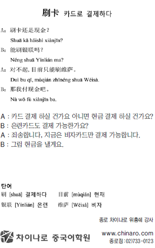 [生生 중국어 한마디] 카드로 결제하다