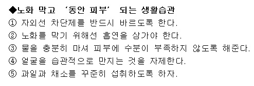 한국건강관리협회 서울강남지부 건강증진의원 임대종 원장은 “피부가 받는 환경적 노화 요인 중 가장 큰 영향을 끼치는 것이 자외선이다. 자외선은 각질층을 거칠고 두껍게 할 뿐 아니라 진피에도 많은 변화를 일으킨다. 콜라겐의 변성이나 탄력섬유에도 심한 변성을 유발한다.”며 “결국 각질은 두꺼워지고 진피는 얇아지고 탄력을 잃게 된다. 그밖에도 모세혈관이 늘어나고 색소 침착이나 색소 소실 등의 색소 변화, 심하면 피부암까지 유발한다.”고 말했다.