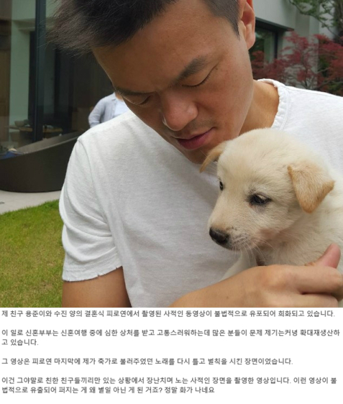 "제 친구 용준이와 수진 양의 결혼식 피로연에서 촬영된 사적인 동영상이 불법적으로 유포되어 희화되고 있습니다
