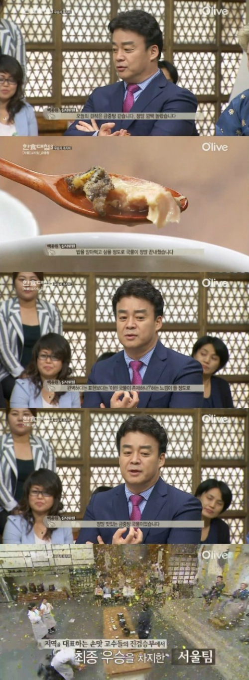 '한식대첩3' 서울팀의 음식에 백종원은 이어 "완벽하다는 표현보다는 '이런 국물이 존재하나' 라는 생각까지 들었다"라는 극찬으로 마무리 했다.